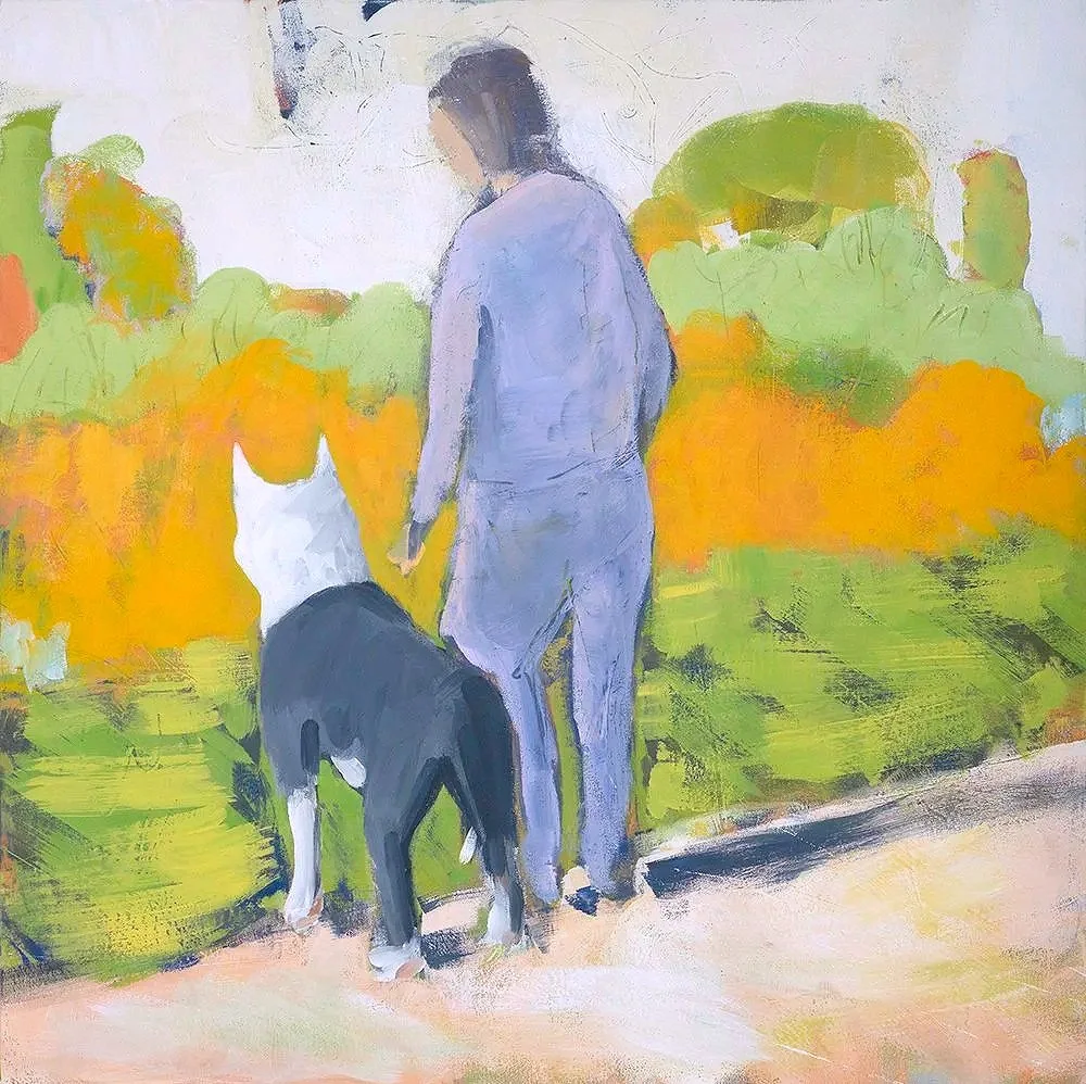 Morning Walk 30” x 30” Clay-based paint, sealed with acrylic glaze on stretched canvasA morning walk with a beloved dog, the gentle sun casting a glow, welcoming the new day — this painting was inspired by my own dog and my own daily walks. $1200 Purchase