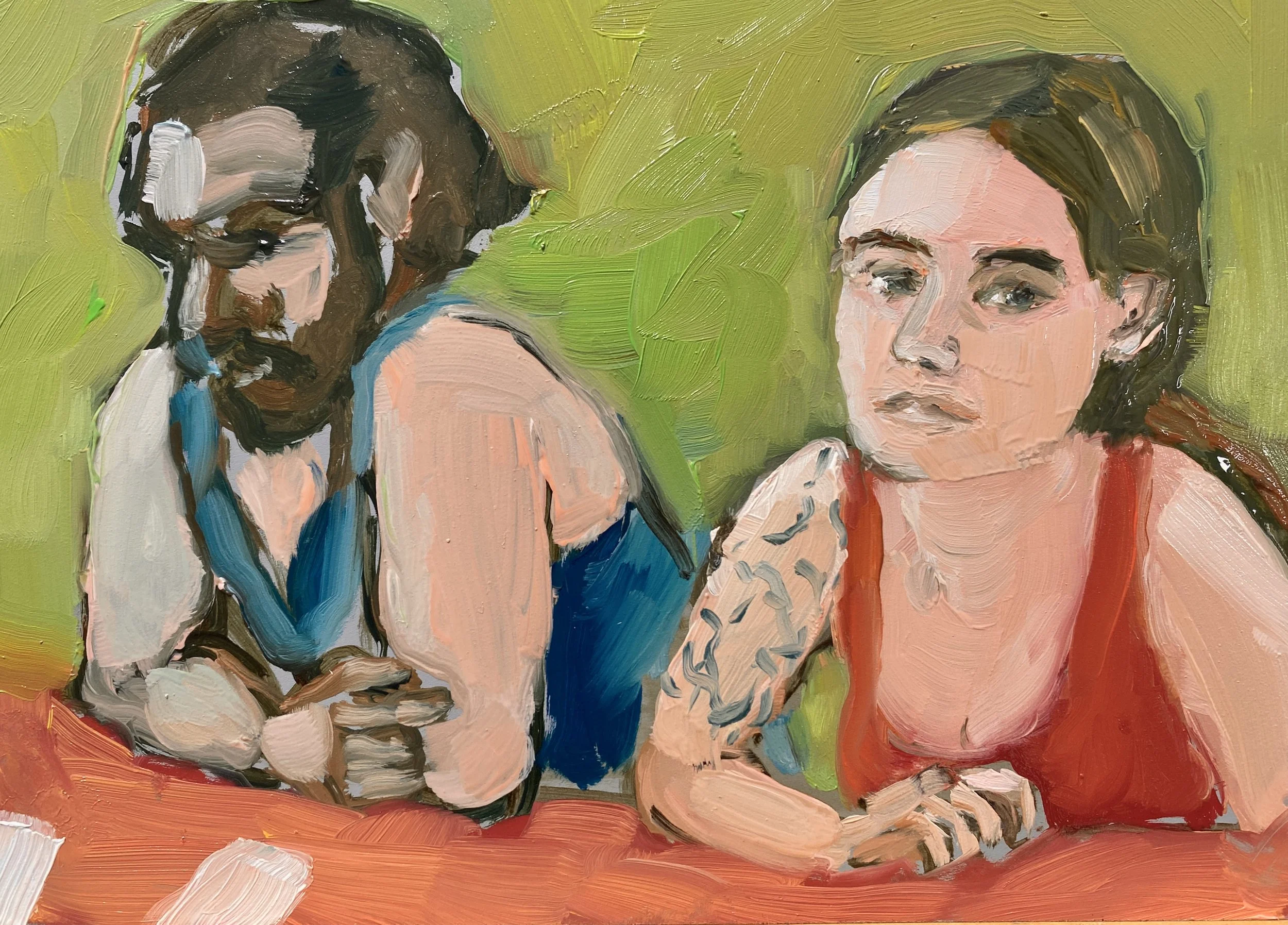 Summer Card Game 5x7 Oil on Masonite Panel, FramedA hot summer day, a picnic table card game, a faraway look. The players are keeping their secrets, but one of them may be soon calling out “hearts.” Purchase